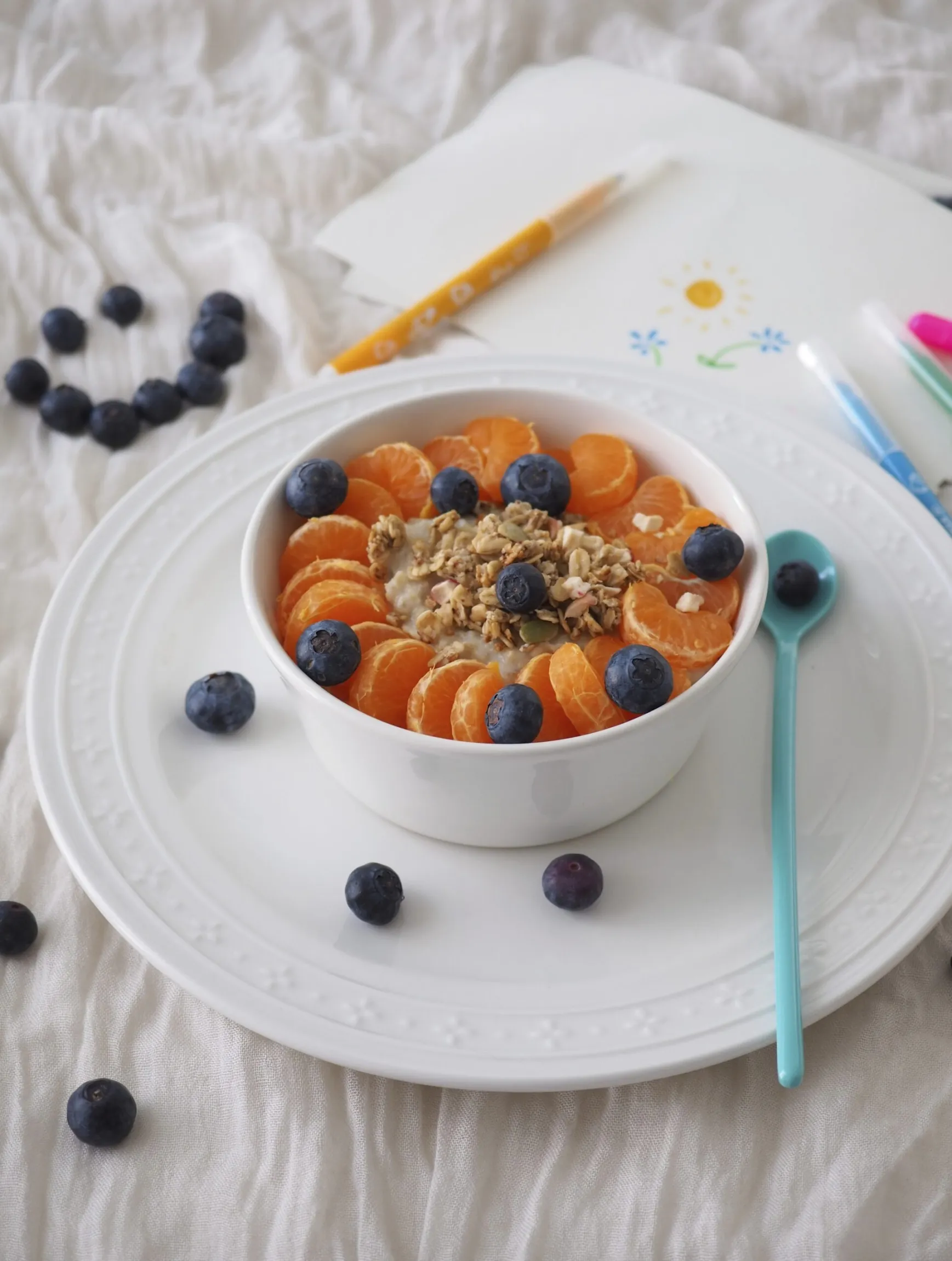 1. Kuori klementiinit ja annostele ne sekä mustikat ja mysli lämpimän puuron pinnalle.