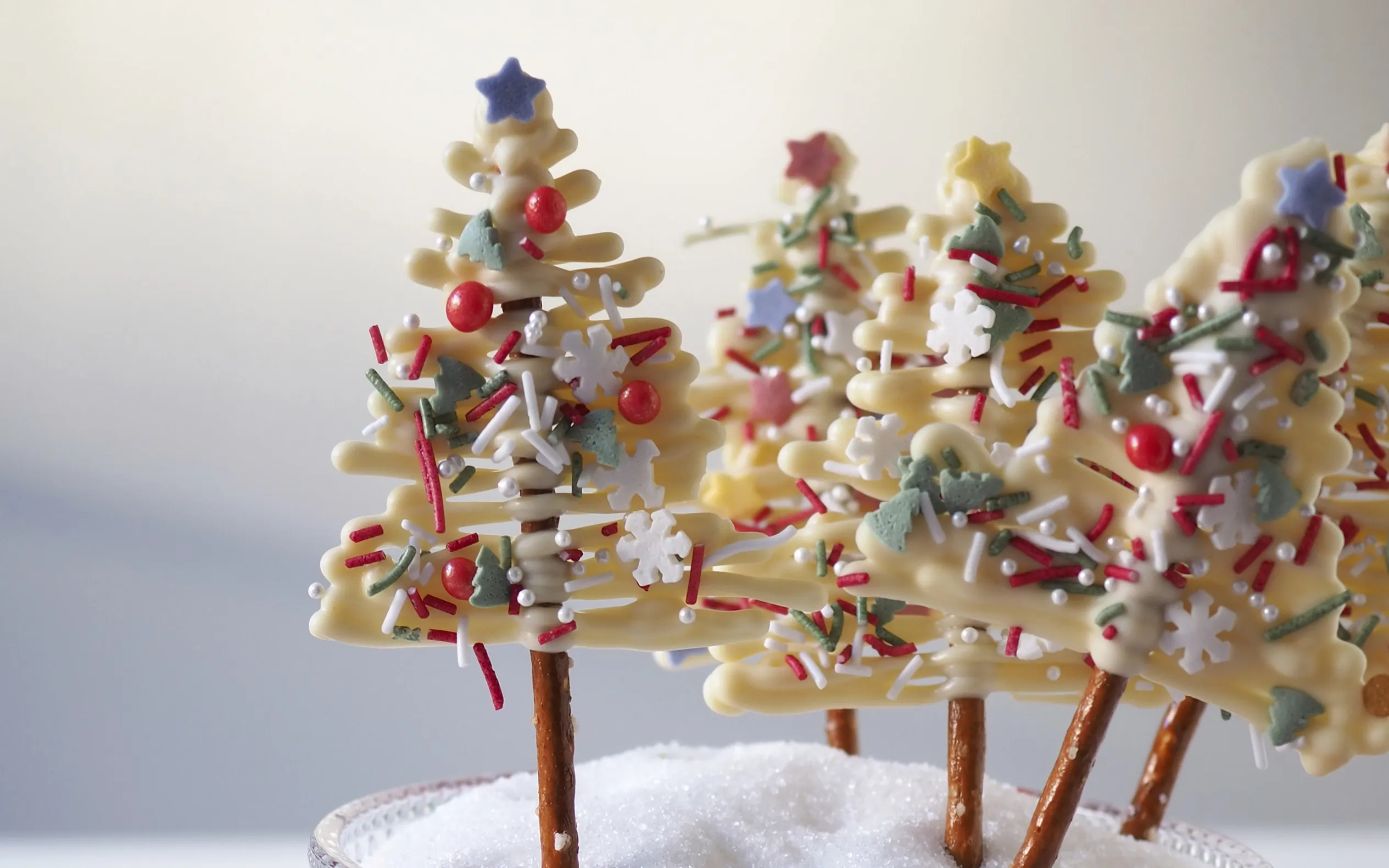 3. Pursota valkosuklaata kuusen muotoon suolatikkujen päälle ja ripottele pinnalle nonparelleja tai strösseliä koristeeksi.